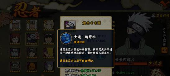 土遁·追牙术:通灵出忍犬西巴和乌鲁西,两只忍犬共同进行一次连协地底攻击,最终将敌人顶浮空,通灵出忍犬后旗木卡卡西可以自由移动。“土遁·追牙术”属于一款消耗型技能,在X轴的判定范围接近全屏,蹭豆能力很强。