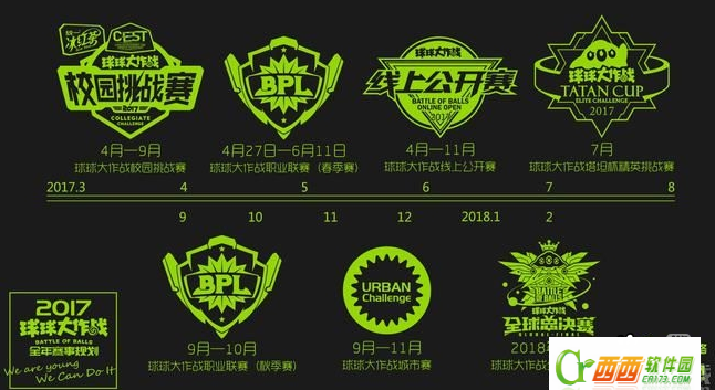 2017年《球球大作战》赛事将囊括校园挑战赛、线上公开赛、BPL职业联赛(春季赛与秋季赛)、“塔坦杯”精英挑战赛、城市赛、全球总决赛等各类赛事。 从2017年4月至2018年2月,赛事内容不间断,赛事层级更丰富。