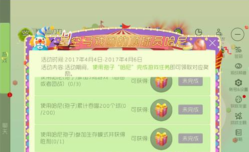 使用哈尼(孢子)累计吞噬200个球,可得马戏团盛装礼盒一份,打开之后,可得愿望魔盒1个,入场券1张;
