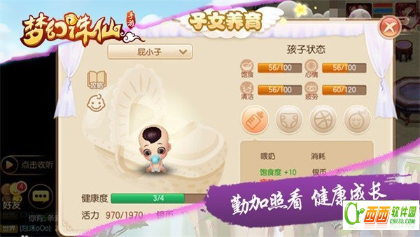 处于婴儿期的宝宝相当脆弱,不能言语不能行动的它们,只能依靠少侠们的悉心照顾方能成长。在这里,婴儿期的宝宝状态有着饱食度、心情、清洁度以及疲劳值这几项指标,少侠们可以通过喂奶、逗乐、换尿片来增加宝宝的前三项指标,不过这些行动都会增加宝宝的疲劳值,只有让宝宝睡眠才能缓解。当宝宝经过一段时间的喂养,健康度满4点时,就可以在少侠的带领下,成功迈入童年期了哦!