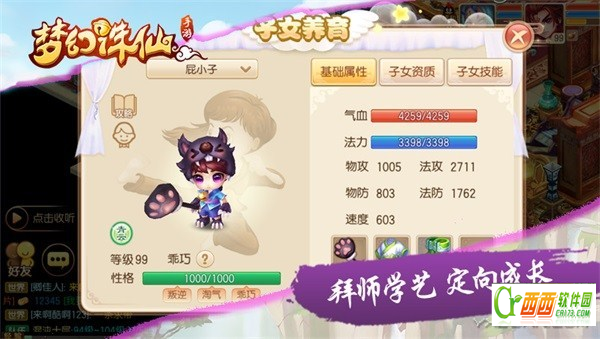 迈入长成期后,子女的成长将拥有更多地可能性。在这里,少侠们可以带领孩子进行拜师学艺,然后查看子女的基础属性、子女资质、子女技能等信息。子女的基础属性根据子女拜入的门派会产生差别,而子女资质和子女技能对于少侠而言则有着更多地可操作性。少侠可以使用道具提升子女的资质,设置子女的通用技能、门派技能以及秘籍技能,还可以为子女进行加点。经过这一系列的培养,宝宝们就将成长为一名优秀的“战士”,在少侠的战斗中贡献自己的力量。