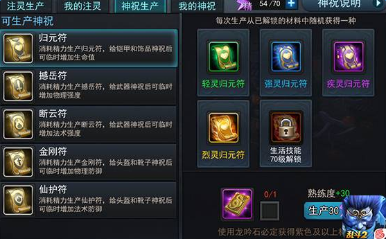 5道神符、5个品级,花式玩转神祝系统不容错过!玩家生活技能达50级后,即可自动开启神祝系统,神祝符有生命符、物理强度符、法术强度符、物理防御符、法术防御符等5个类型,每个类型又细分为绿、蓝、紫、金、橙5个品级,消耗一定精力即可进行神祝符的生产。想一蹴而就的急性子玩家,也可在市场交易系统中直接购买紫色及以上品级的神祝符,满足你心急也吃得了热豆腐的美好愿望!精力旺盛可大批量生产神祝符的玩家,一夜暴富、发家致富的机会来了!