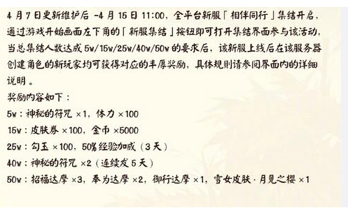 在今天维护后到4月15日11:00,玩家只要参与到相伴同行的新服集结活动,就可以在新服开启获得雪女皮肤哦,只有新服才有的,不是人都有。