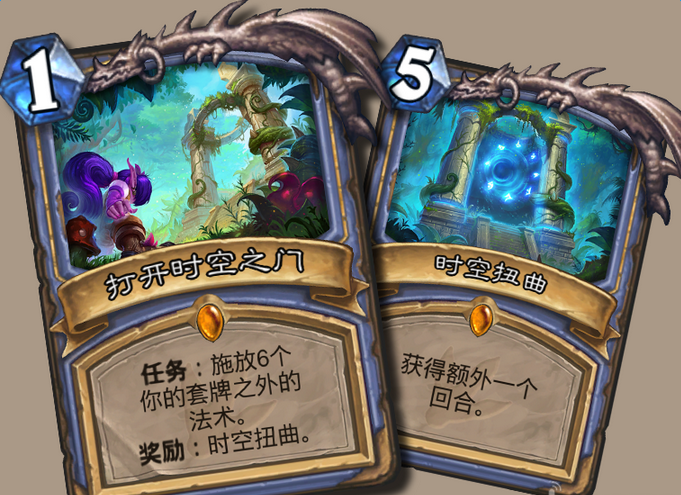 任务卡牌是《炉石传说》的全新卡牌类型。任务卡牌均为传说品质,因此每套卡组只能放入一张,并且它总会出现在你的初始手牌中。每个职业所拥有的任务卡牌都有独特的要求条件,你必须满足所有条件才能完成任务。完成任务将会带来意想不到的变化,比如法师的任务卡牌“打开时空之门”,以及完成后奖励的卡牌“时空扭曲”——它将使你获得额外一个回合,具体怎么玩还有待你去发现。