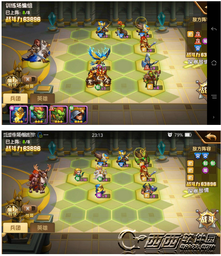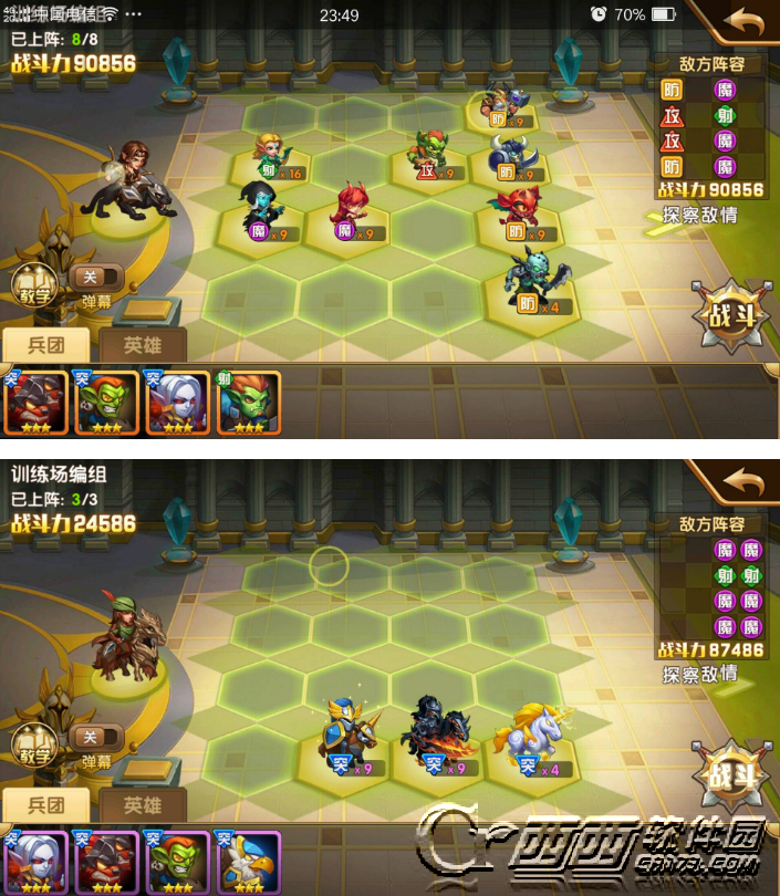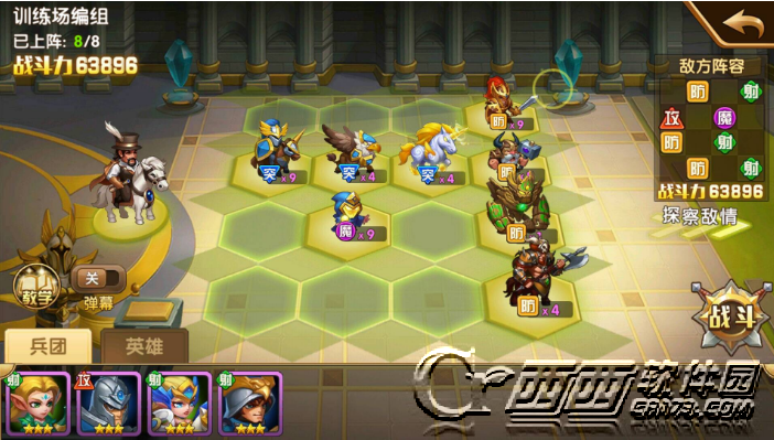 第一关,第一关相对简单敌方弱点在于第二横排的地精战士,相信很多玩家对攻击兵团很不看好吧?首长各方面不突出均衡发展,其次也比较脆皮,除了那百分之五十的破防隐藏属性外没有其他亮点比较平庸,除了枪兵带一个控制技能外其他的攻击兵团(领主兵团除外)怂的不能直视啊。只要抓住这个弱点3突齐出突破至后排,这里注意下技能控下独眼不然突进军团很容易在这吃亏,清完后排前排逐个击破,完美S