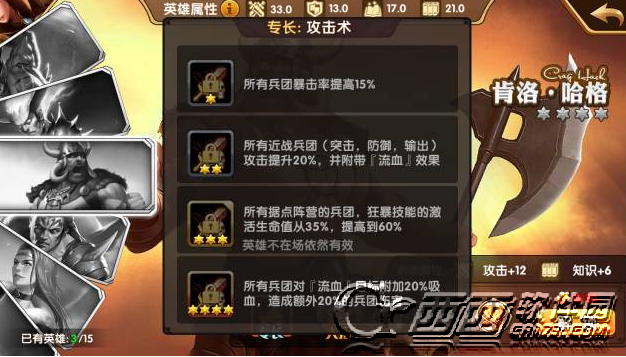 以肯洛哈格为例,他的4个专长都能够给予突进部队大幅度提升,因此在配置相应的兵种时,主要的输出兵团以突进为主,其他位置为辅助。比方说8个兵团站位,后排只要一个擅长治疗的魔法兵团和一个射手兵团,前排使用2-3个防御兵团,随后其他位置全部给予突进兵团,如此布阵,其中所能给予的英雄加成幅度远非其他英雄所能比拟。
