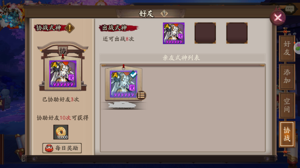协战只有前五十次可以获得奖励。(好友协战输了也算次数,好友用对方的式神达到十次将不会出现在战斗上面)