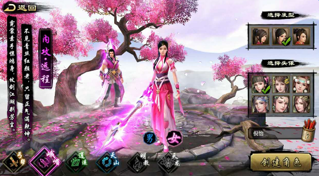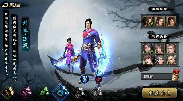 门派上目前提供了玩家峨眉、丐帮、天山、逍遥四个门派,创建人物时每个门派选择都可以出现一段华丽的出场效果。选择好门派后玩家还可以进行男性和女性角色的选择,并且和端游一样支持玩家选择角色发型和头像,比较可惜的是在本次测试版本中,明教这个在端游公测时最热门的门派没能开放。另外在职业定位上《天龙八部手游》手游和端游也保持了高度一致性,如峨眉是内功.远程.治疗型的门派,而天山则是刺杀暴击型的门派,符合老玩家的心理预期!
