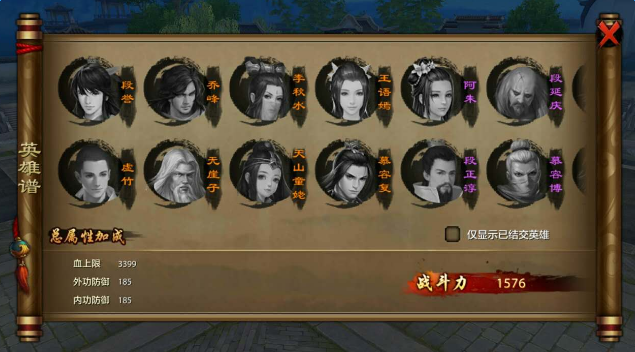 之前的游戏中的经典人物都是NPC,在手游中加入了英雄谱功能,让我们离经典人物更近。点开游戏中的英雄谱,就可以看到你结交了哪些英雄,俗话说在家靠父母,出门靠朋友,这些英雄榜上人物可是你日后称霸江湖的强力后盾,每一个那都是不能不结交的!