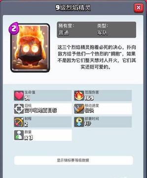卡牌解析:烈焰精灵是一张2费的普通卡牌,这张卡在实战中还是比较独特的,2费的它可以召唤3个烈焰精灵,这3个精灵的攻击方式属于自爆和AOE的攻击形式,虽然只是一次性的,但是由于伤害较高,所以能够快速的解除敌方一些血量较高的人海卡,如亡灵大军和哥布林团伙等,并且也是能够让野蛮人和三个火枪手这类卡牌直接残血。