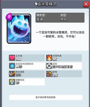 卡牌解析:冰雪精灵是一张非常灵活的1费控场卡,他可以让敌方范围内的敌人冰冻1.5秒,所以无论是用来防守还是辅助进攻都非常的灵活,并且往往能起到意想不到的控场效果,特别是在对抗一些低费的人海卡时,搭配公主塔也有着很好的赚费和解卡性,如骷髅军团和哥布林投矛手等。