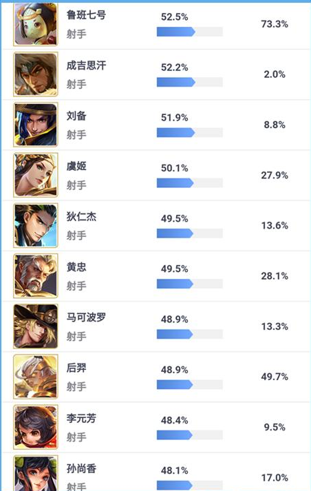 没想到的是游戏出场率第一的鲁班竟然胜率也排第一,这不科学啊?!而S7赛季的标志,最近两个赛季表现强势的虞姬则在两个榜单中都排在了第四,处于中游偏上一点的位置。而曾经的射手一姐香香这个游戏版本表现平平,在胜率方面垫底