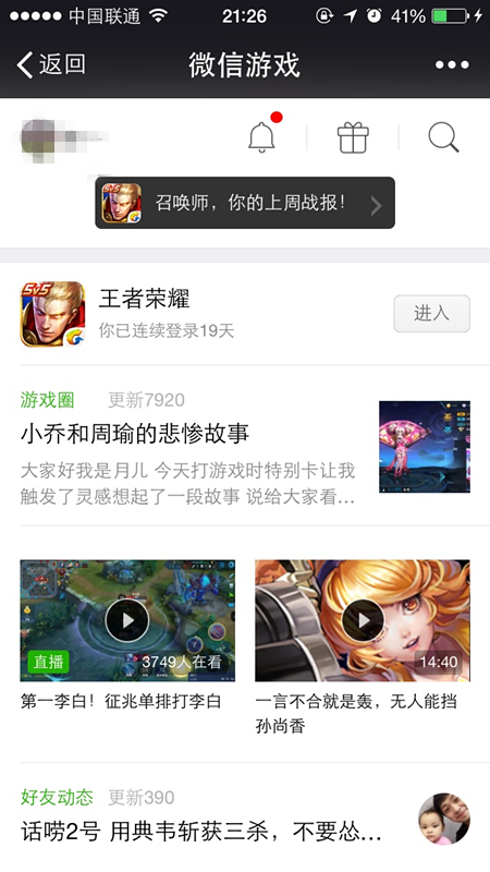 进入微信-游戏-可以看到召唤师,你的上周战报!点击进去
