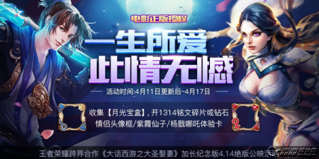 大话西游经典重制,完成指定任务获得重制的月光宝盒,可能开出的奖励:钻石,铭文碎片,钻石*1314,铭文碎片*1314,情侣头像框,大话西游羁绊英雄体验卡