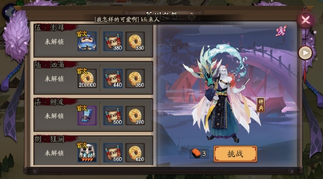 阵容:桃花妖+惠比寿+椒图,用神乐做主角。这个阵容虽然打起来有点慢,不过相对来说还是比较稳的。第一回目:金鱼姬*1、古笼火*3