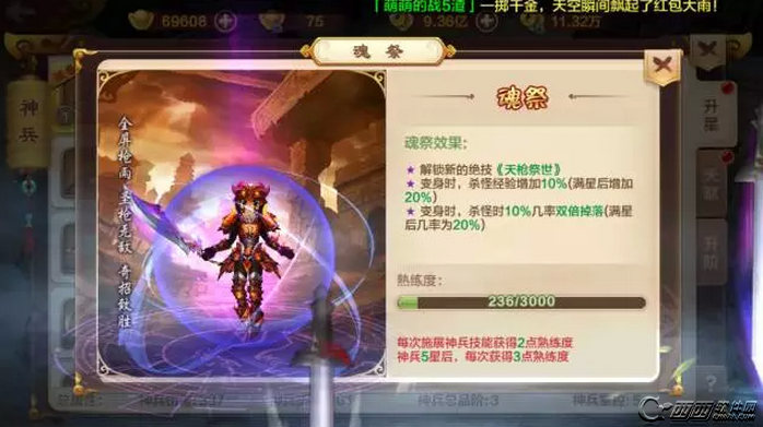 新手前期最容易获得的绝技,消费一定金额即可获得追魂五星枪碎片,合成神兵后,刷怪至熟练度升满,即可解锁该绝技,绝技效果全屏幕造成6段伤害,且一定命中,小编想了想如果在势力战土豪完整的释放了一个天枪祭世,那真的是肉山血海了...