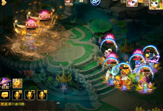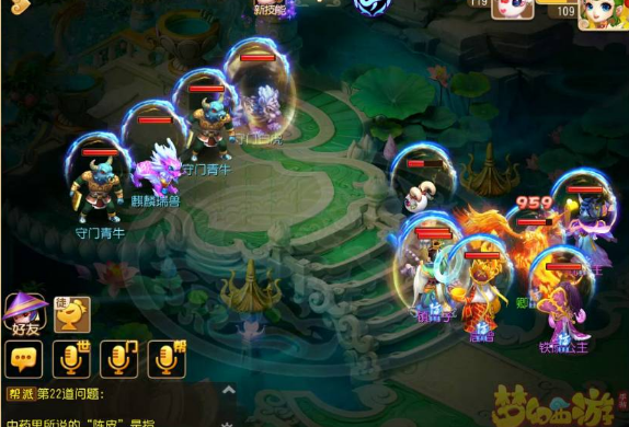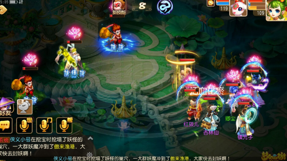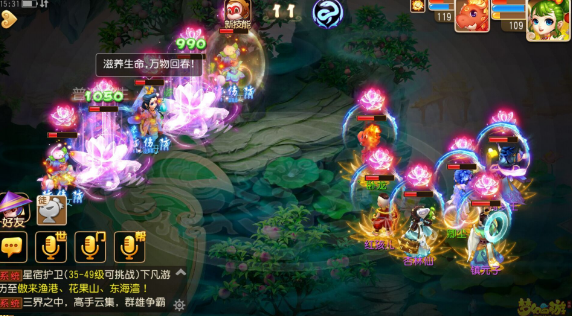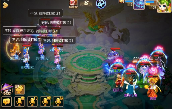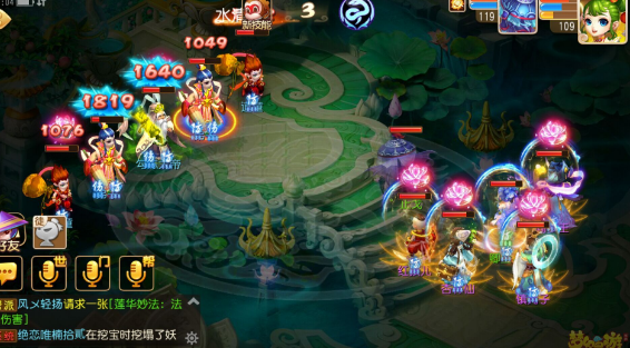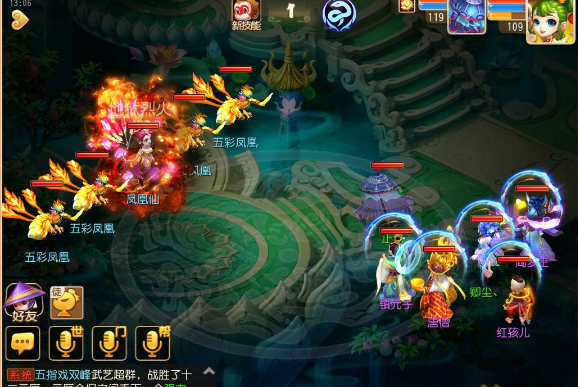 注:要奶量输出就有点乏力,所以我大胆的选择五魔进去……当然秒的不疼T^T不过能加一点算一点呗,开的千里神行buff让镇元子的速度比对面的狮驼龙宫快,嘿嘿抖中一下爽歪歪~普陀的大招合理运用这关也没啥难度了,只要把血线稳住就好