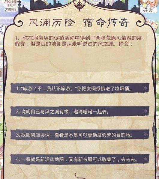 先简单介绍下宿命之书的玩法,宿命之书就是风渊传奇中的活动,玩家可以通过宿命之书活动,根据玩家自己的不同回答,最后可以获得风渊传奇活动两套套装之一的兑换半价优惠。而且在玩家没有确定之前,还可以重复选择的。