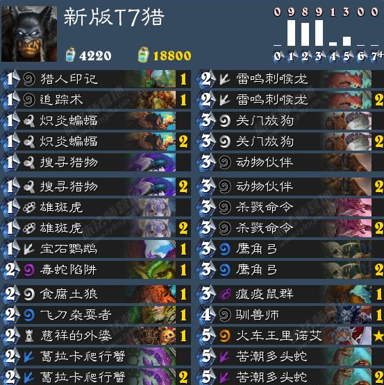 打法思路:严格来说“T7猎”只是一套偏快攻的中速卡组,打法也相对简单,起手留牌考虑低费野兽随从,如果遇到战士可尝试找一下爬行蟹。斩杀手段主要依靠杀戮命令、火车王及苦潮多头蛇直接打脸,也可以利用刺喉龙的进化隐藏一波土狼,利用小野兽或放狗的换场养成大狼打脸伤害。不过由于套组的过牌手段较少,中后期可能会陷入抽一打一的窘境。