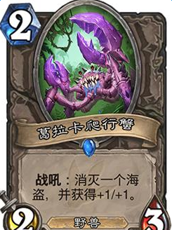 葛拉卡爬行蟹:安戈洛版本更新以后虽说对快攻卡组有了一定的削弱,不过海盗战依旧是活跃在天梯的各个阶段,带这两只螃蟹的主要原因就是为了对付海盗。2费2/3的身材本就不亏,抓一只海盗就是血赚!