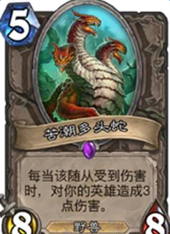 苦潮多头蛇:多头蛇可是算是“安戈洛”版本中十分成功的一张卡牌,5费8/8的超模身材加上野兽属性,绝对是猎人老爷的良配。虽然遇到大量低费随从或火山喷发等会雪崩,不过瑕不掩瑜,这张卡依然是大量中前期快攻卡组的首选。