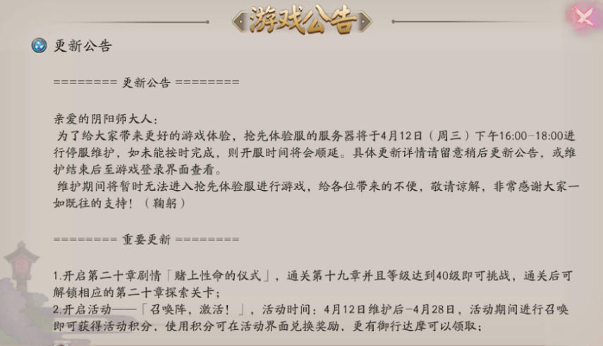 抢先体验服将在4月12日16:00-18:00进行临时停服维护,预计时间2小时,请大家等待维护后再进行登录游戏,感谢大家一如既往的支持!