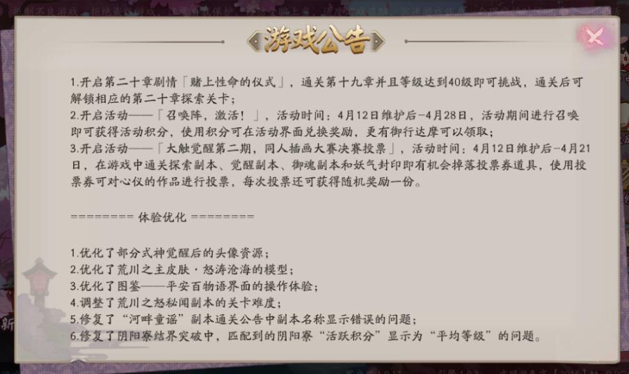 阴阳师体验服更新了,20章的剧情赌上性命的仪式马上开启。4月12日阴阳师体验服更新内容:1、第二十章剧情"赌上性命的仪式"2、开启活动:召唤阵激活,获得积分奖励3、大触觉醒第二期投票活动,下面西西小编为大家带来具体的更新情况。