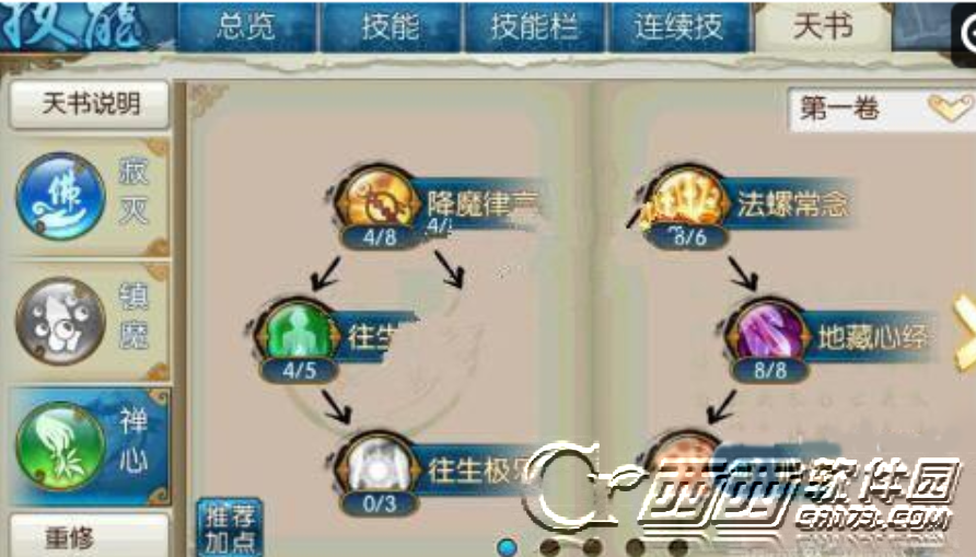 第一卷:降魔律言4级,法螺常念6级,菩提荫佑4级,地藏心经8级,灵魂绽放2级。(24点)
