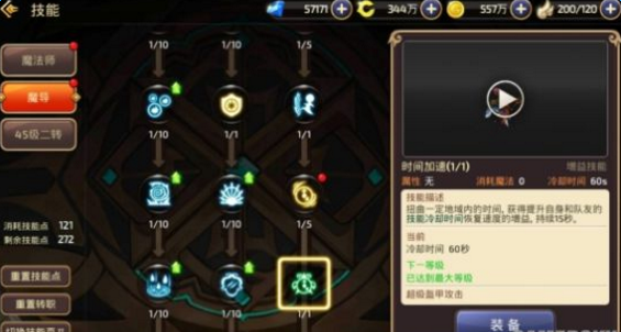 时间加速作为魔导唯一的一个增益技能,可以降低自己和队友的技能冷却时间,使得己方能够更加频繁的使用技能造成更多伤害,所以是魔导优先考虑升级的技能。