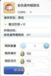 彩色蛋壳帽属性为魔法防御+10,制作彩色蛋壳帽需要1个蛋壳帽,还有红色、黄色和蓝色染料各20个。只需要收蛋壳帽图纸,颜料可以在梦罗克道具商人隔壁的小妹妹兑换,需要3种原色搭配,黄红蓝,可配成青紫白黑。