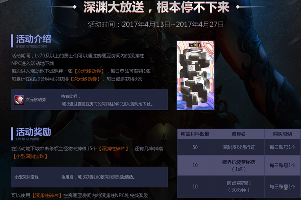 活动期间,Lv70及以上的勇士们可以通过赛丽亚房间内的深渊柱NPC进入活动地下城。
