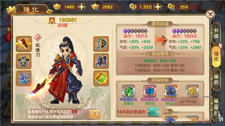 在强化界面可以看到当前装备的强化星级,选择装备可以看到装备当前的强化加成,和再次强化所需要的材料,由于装备强化有成功几率,所以强化失败后会失去材料并无法升级,但会有一定的次数保底,达到后悔必定成功。