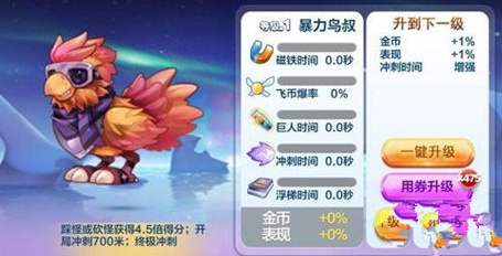 天天酷跑暴力鸟叔BUFF:磁铁时间+3.5秒,飞币爆率+35%,巨人时间+3.5秒,冲刺时间+3.0秒,浮梯时间+3.5秒;