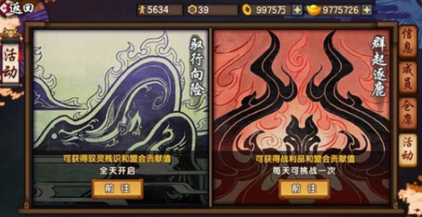 现有盟会活动有两种:驭行向险和群起逐鹿。玩家参与较高等级的盟会活动后,即有几率获得绝世装备碎片。