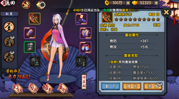 仙剑奇侠传幻璃镜中装备分为武器、头饰、腕部、上身、下身、足部、法宝、饰品,共计8个部位,装备分为绿、蓝、紫、橙四种品质。