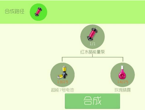 合成红水晶能量泵需要用到25个超能7号电池,加上25瓶玫瑰精露。