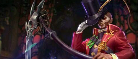 这是一款风格与之前皮肤大不一样的原画,目前暂时还是曝光阶段,原画上看这个脸有点干瘪,有种瘦骨如柴的感觉,不过那把标志性的镰刀还是让大家很容易就认出他的,身上还背着两瓶毒剂试管,红色的外套白色的手套还有那顶绅士帽都十分的亮眼