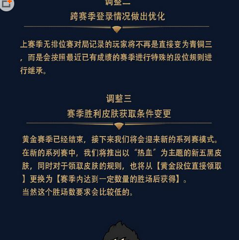 新的系列赛中,会推出【热血】为主题的新五黑皮肤,同时对于领取皮肤的规则,也将会从【黄金段位直接领取】更换为【赛季内达到一定数量的胜场后获得】。当然,这个胜场数要求会比较低