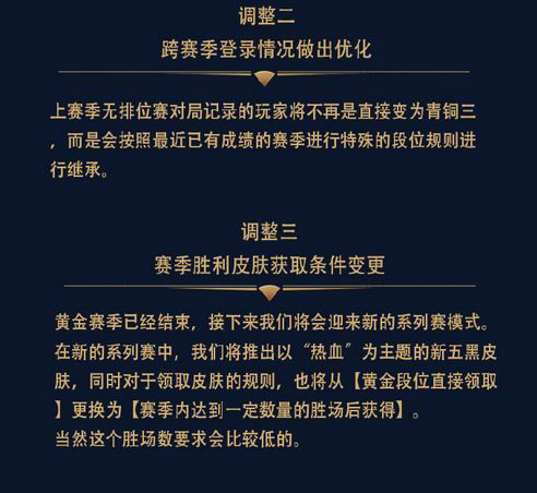 新的系列赛中,会推出【热血】为主题的新五黑皮肤,同时对于领取皮肤的规则,也将会从【黄金段位直接领取】更换为【赛季内达到一定数量的胜场后获得】。当然,这个胜场数要求会比较低。
