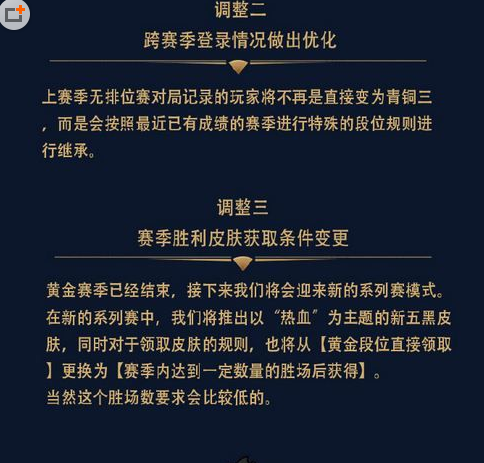 新的系列赛中,会推出【热血】为主题的新五黑皮肤,同时对于领取皮肤的规则,也将会从【黄金段位直接领取】更换为【赛季内达到一定数量的胜场后获得】。当然,这个胜场数要求会比较低。