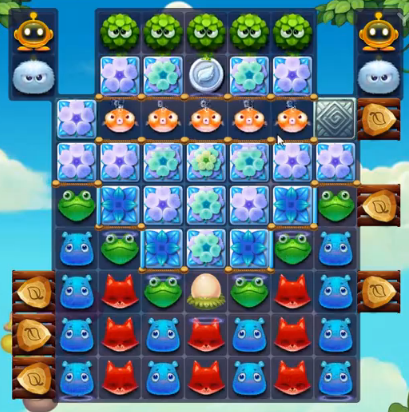 这个关卡左右两边分别是魔法石以及毛球闪电鸟,中间是雪花和气鼓鱼上面则有一排的藤条精。地图被藤条给隔开了,所以要多多利用孵化鸡蛋来合特效哟。