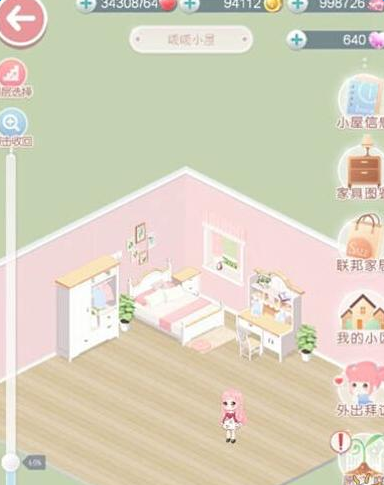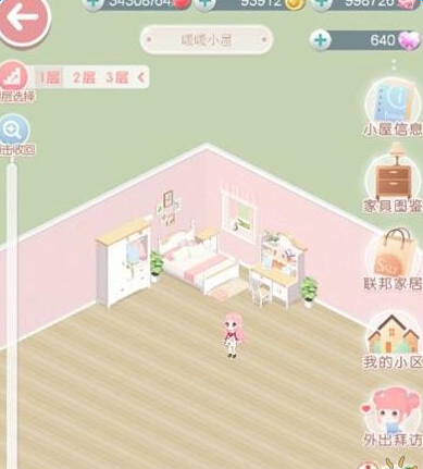 默认之下,小屋只有1层,墙纸是粉红色的,地板也没有多加修饰。如果需要增添小屋里的家具或是装修小屋更换墙纸门窗地板的话,则需要花费一定数量的游戏币来购买。