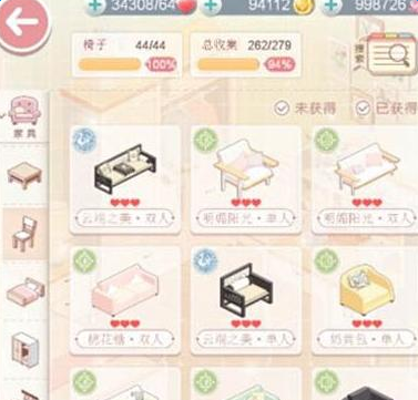 家具图鉴:小屋的图鉴分为家具、装饰、家电、装修4大分类。和衣柜一样,这里可以看到家具的收集度,小屋总收集度,并可以从国别风格和名字两方面进行搜索定位。