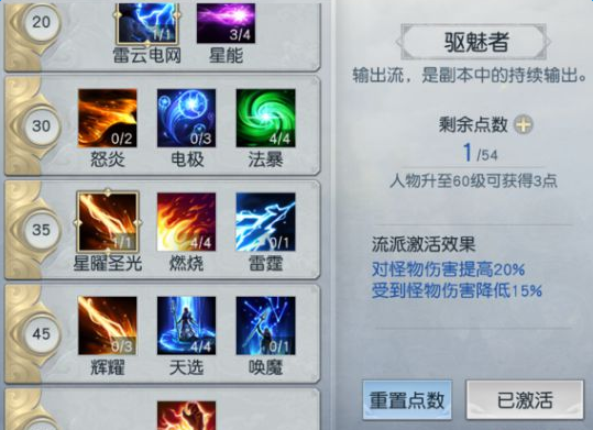 20级可激活驱魅者,激活效果:对怪物伤害提高20%,受到怪物的伤害降低15%