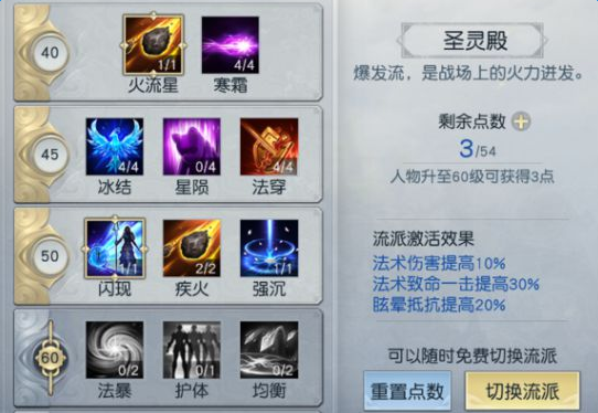 星陨:额外提高火流星暴击率,1级10%,4级40%,每级消耗4点点数。点满这个被动需要投入16点点数,在点数吃紧的情况下是一个非常大的投资,但收益也是非常可观的。圣灵殿本身拥有30%的法术致命加成,这额外的40%爆率可以让火流星接近百分百暴击,走暴力输出路线的同学可以考虑点满~