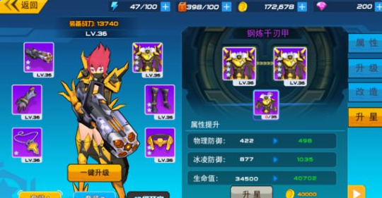 装备有分绿色<蓝色<紫色,绿色是新手任务送的,蓝色可以通过副本通关星级箱子获取,扫荡副本可获得碎片,还有金币抽可以获得。紫色装备可以通过7天任务、钻石抽、商店获取。同一套装的装备每2件、4件、6件可以获得套装加成。装备升级、改造、升星可以提升战力