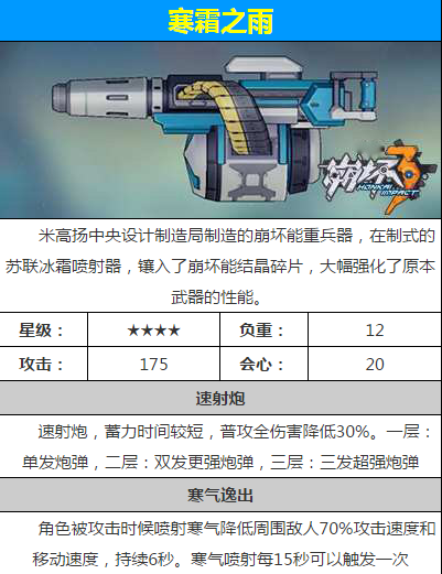 以上就是寒霜之雨技能属性图鉴了,不知道小伙伴们看过之后有什么想法,作为一把四星武器,伤害上自然是略有不足,同时作为速射炮,伤害低只怕是硬伤。