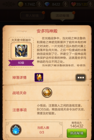 1.安多玛神殿里除了BOSS大天使卡斯迪尔之外,还设置了三个小怪,难度不大,自己和其他两个队友一人打一个就可以了;