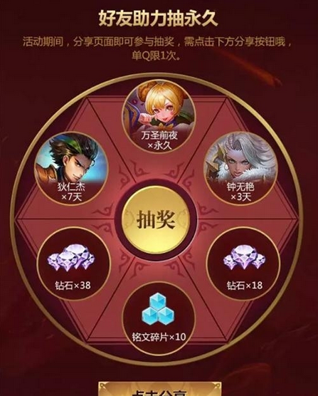 奖品内容:万圣前夜皮肤永久、狄仁杰7天、钟无艳3天、钻石*38、钻石*18、铭文碎片*10