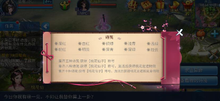 玩家打开机缘丹可以随机获得一种颜色的诗笺奖励,使用诗笺后会有幸运加成。玩家可到桃花仙处查看诗笺,一共有十种诗笺: